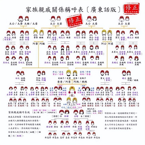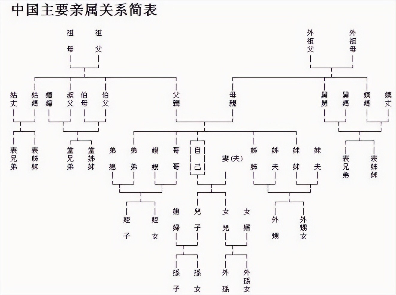 人类的繁衍生息是相通的,各个民族都具有表示家庭成员关系的亲属称谓系统。亲属称谓指的是以本人为中心确定亲族成员和本人关系的名称,是基于血亲姻亲基础上的亲属之间相互称呼的名称、叫法。它是以本人为轴心的确定亲属与本人关系的标志。汉族的亲戚关系条理例分明尊卑有序:比自己长一辈的称呼有姨父叔伯姑舅,同辈的有兄弟姐妹嫂等等,下一辈有侄甥等等。