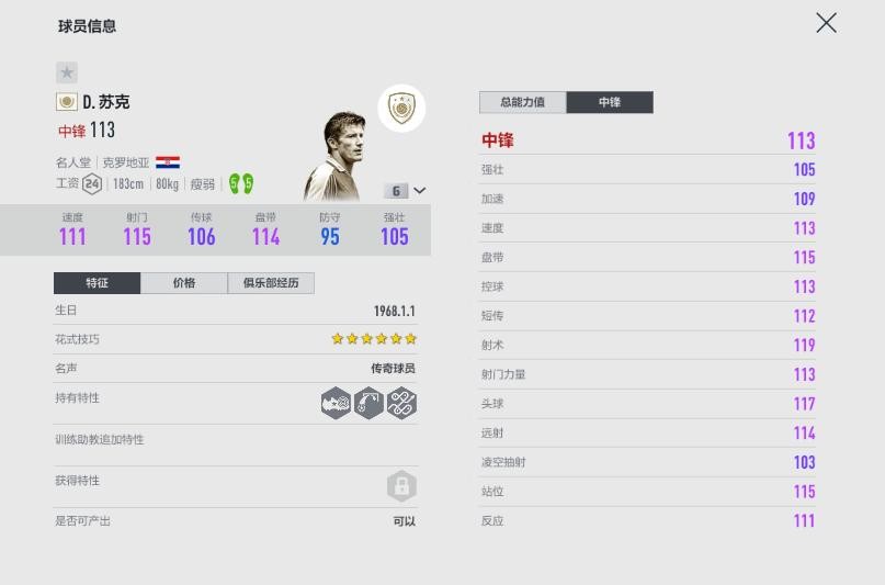 达沃·苏克,1968年1月1日出生于前南斯拉夫奥斯蒂耶克,克罗地亚足球运动员,司职前锋,曾获得1998年世界杯金靴奖以及西甲联赛、国王杯、欧洲冠军杯等冠军。可以说,在大罗时代的足坛,苏克是为数不多可以在世界级舞台上与他相提并论的顶尖巨星,而效力过皇马等豪门的苏克也有着辉煌的职业生涯。在FIFAOnline4中,苏克是一名非常全能的前锋球员,身材不算高大的他在球场上奔跑能力出色,进球效率极高,下面就让我们一起来看下苏克在游戏中的表现吧。