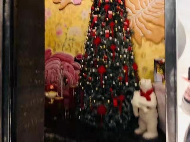 一进门,映入警方眼帘的是一株色彩艳丽的大型圣诞树伴随着周边装饰的玩偶,以及以粉色为基调雕刻着花朵的墙面。
