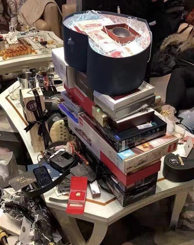 流传出的现场的照片被深扒,不少火眼金睛的网友们辨认出了剩下的大部分礼物:Prada、纪梵希等一线高端品牌礼物占据了多数,还有多只动辄几十万的男士腕表,加起来至少达到了两百余万。