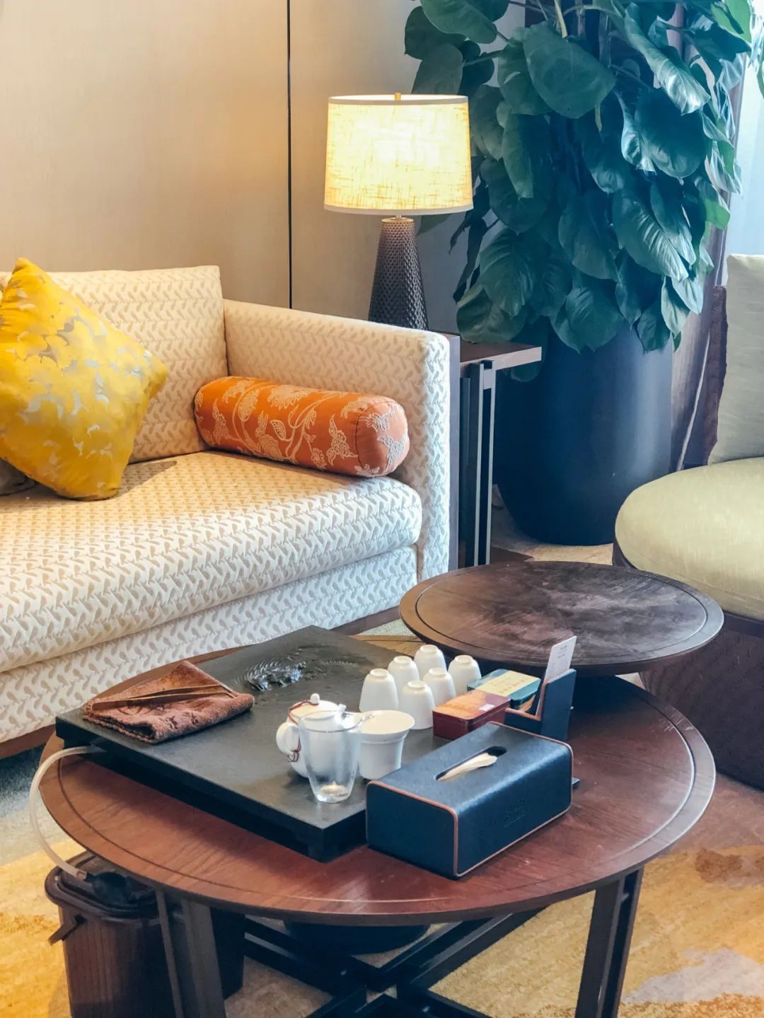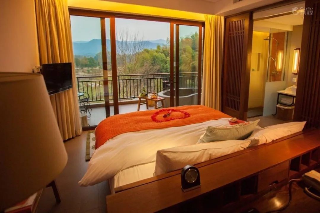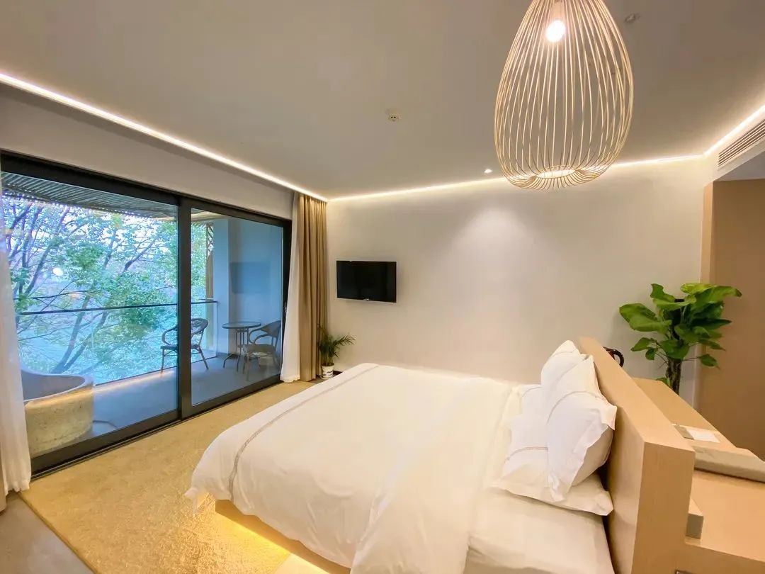 房间是新的布局,明亮清新的日系风格,一进门就给人舒适的体验,巨大的玻璃,可以看到阳台外的景观,青葱的树木,温柔平静的湖水,在阳台泡汤时便可尽览。
