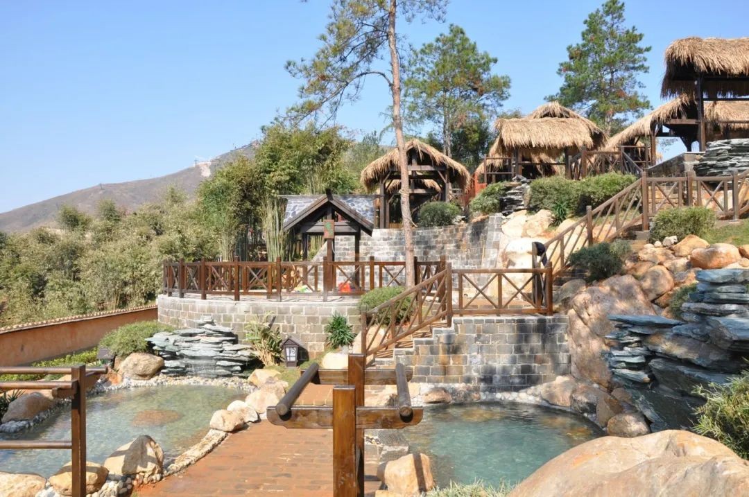 茅草为亭,温泉为院,蓝天森林为背景,在自然山水间,使人放下心中的的压力与束缚,尽享原始的宁静悠闲~