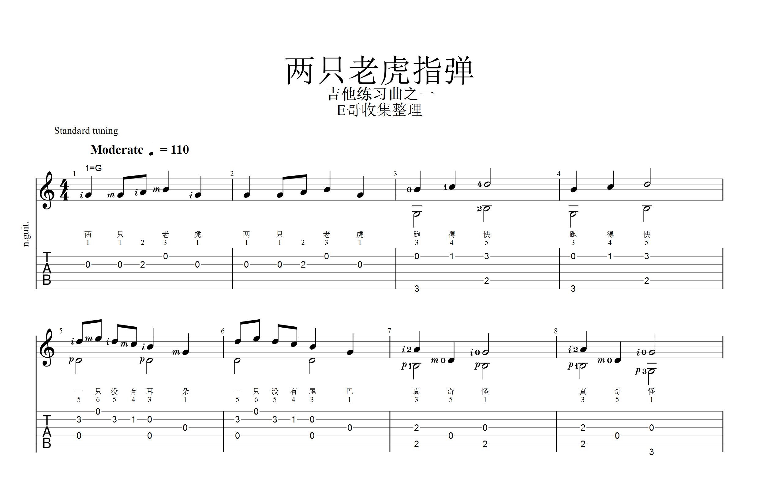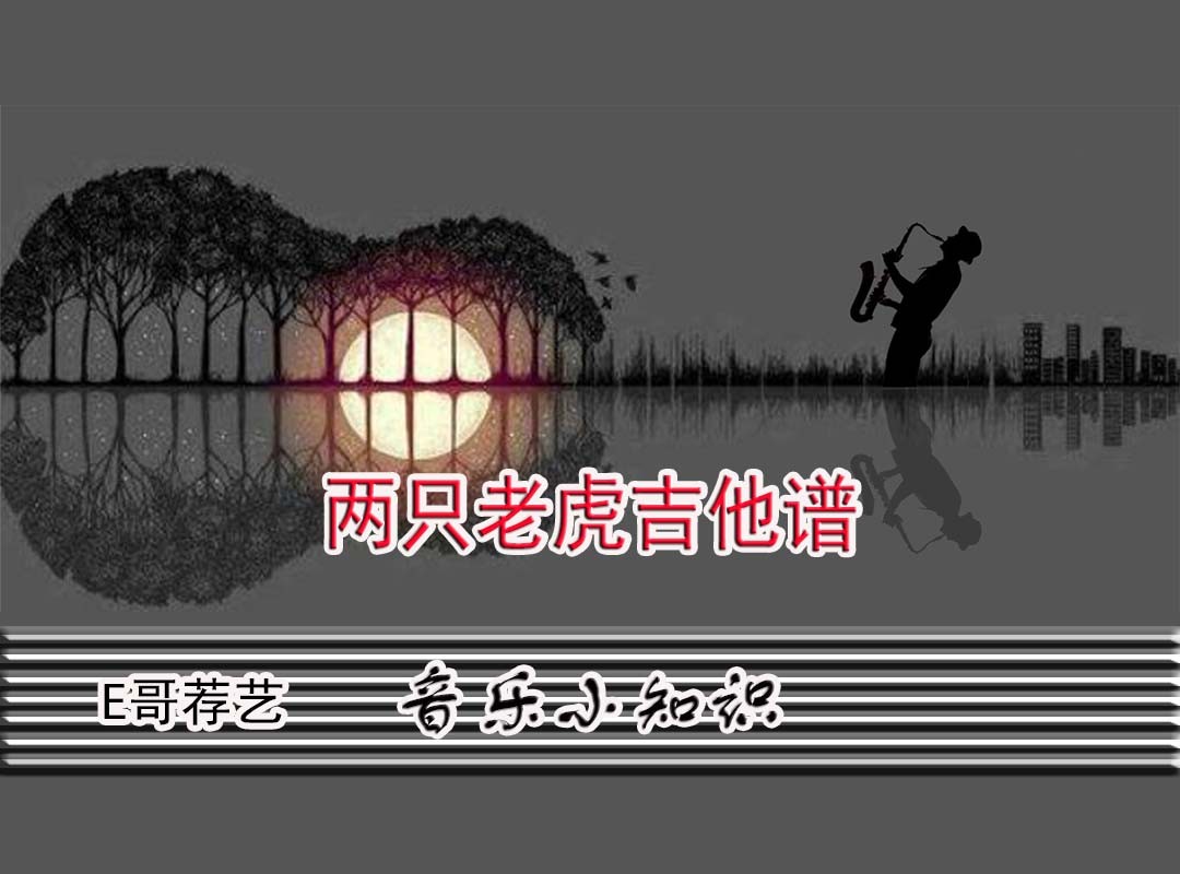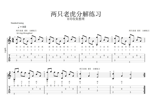 下面的《两只老虎》分解弹奏吉他谱子,适合入门练过一个月以上的学生进行练习。