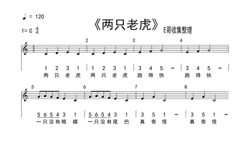 《两只老虎》来源不是很明确,有的说是根据法国叫作《雅克教士》、德国叫作《马克兄弟》、英国叫作《约翰兄弟》的歌曲改编而成。其中中文版本主要改为《两只老虎》流传甚广。深受广大儿童的喜爱。现在许多乐器学习中都用此曲作为入门练习曲。还有此曲在北伐时期改编的中文歌名为《打倒列强》。