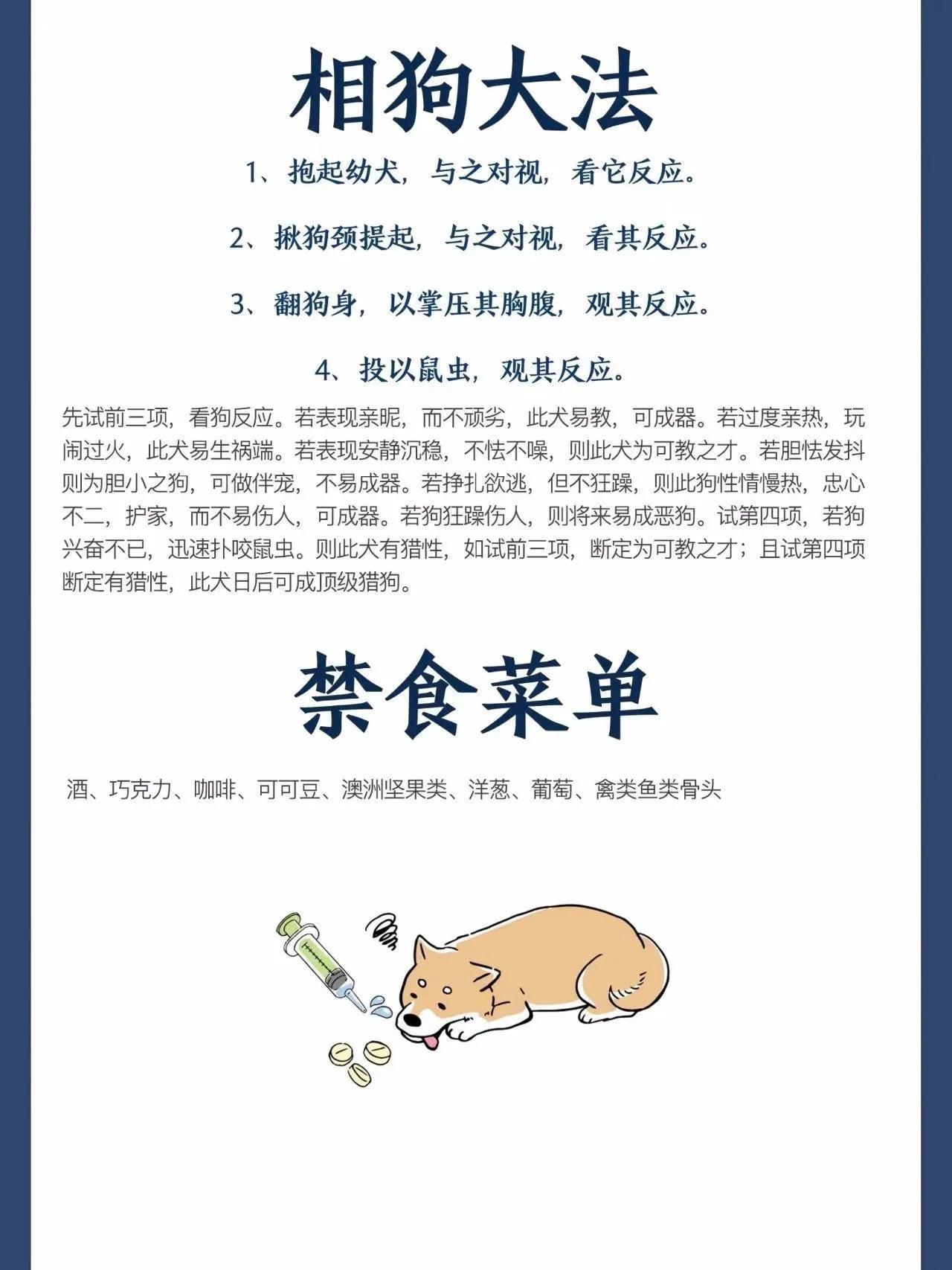 狗狗调养口诀:栓养狗儿性情凶,不是熟人不能碰,看场看家真不赖,贼人稍近吠嗡嗡。散养狗儿体格好,有病钻荒把药找。出恭在野施肥料,闯荡江湖武功高;每逢家主临危时,好狗救驾从不孬。娇生惯养如侍亲,容颜俊美气派新,性情温柔像绵羊,鸡鸭都敢来欺凌。常伴君侧友谊深,闲来挑逗可怡情。训养狗儿通人性,乖巧听话又聪明,主人做事它帮忙,儿女都没它顺心。养狗喂狗有技巧,不费钱来长得俏。五谷杂粮都能喂,常沾荤肉个子高。萝卜肝蛋和玉米,常吃易得好皮毛。喂狗须投七分饱,撑多胀肚易病倒。狗儿若是食的好,家族富贵气派高。#分享你家狗狗#