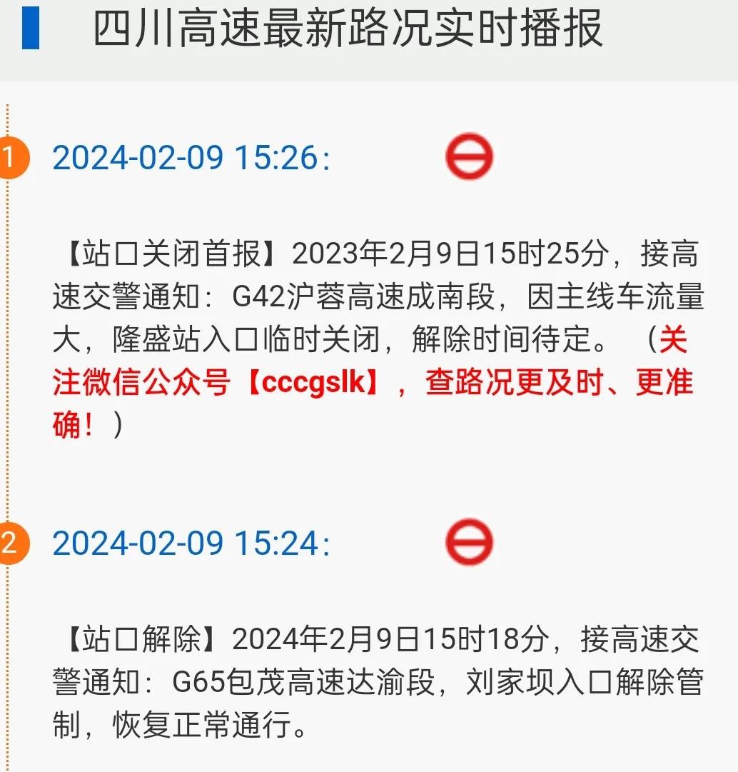 四川交通部门发布的最新公告,接高速交警通知:G42沪蓉高速成南段,因主线车流量大,隆盛站入口临时关闭,解除时间待定。
