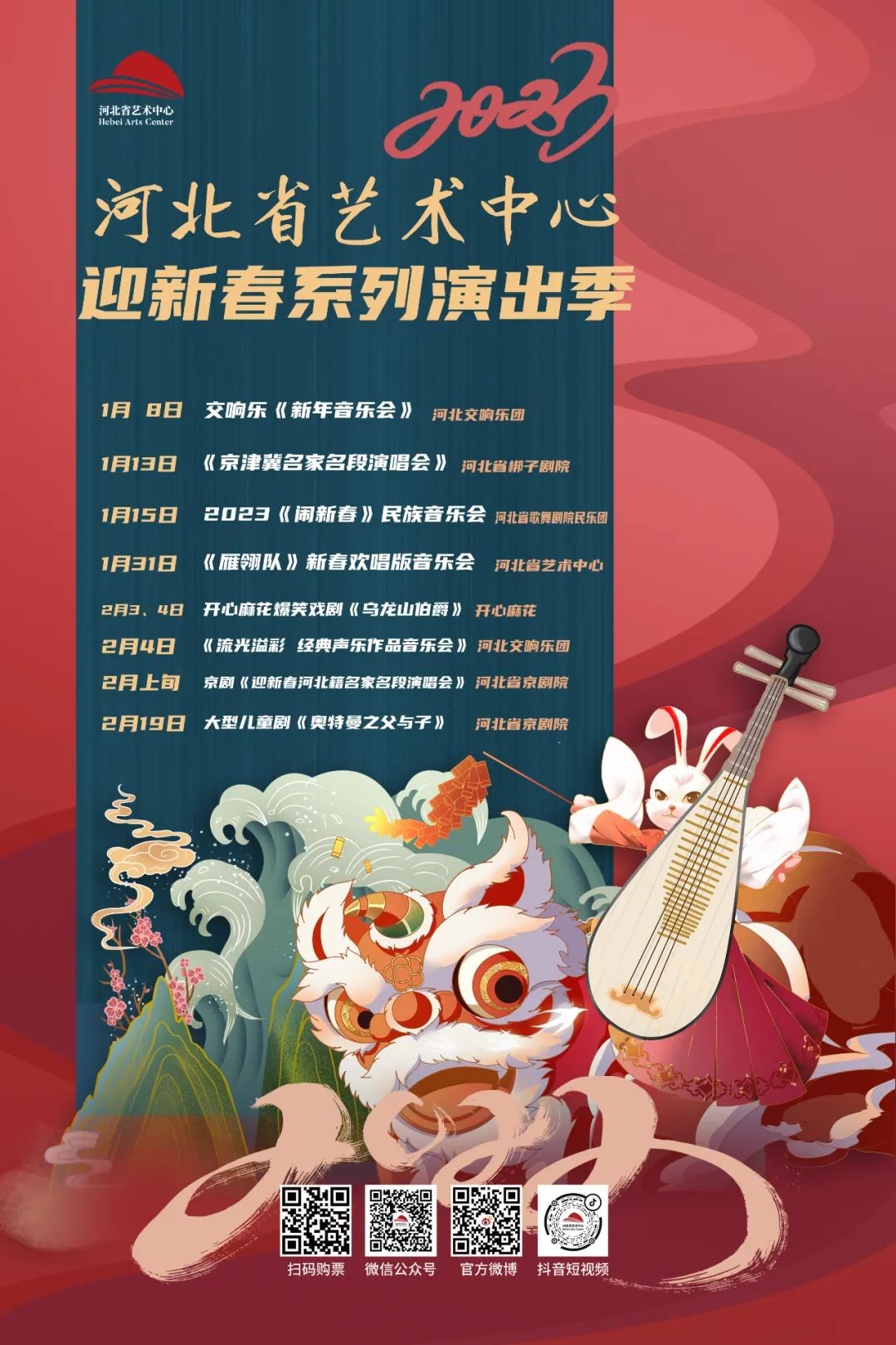天虎驱寒尽,瑞兔带暖春。岁末将至,新的一年即将踏歌而来。为进一步贯彻落实全省文化和旅游系统“迎双节”动员部署工作会议精神,河北省艺术中心主动谋划、积极发力,紧紧抓住“双节”假期有利时机,将于2023年1月8日起,全面启动“迎新春系列演出季”。本次演出季以“看好剧,过新年”为初衷,演出团体以省直文艺院团为主,演出内容包括交响乐、民乐、歌剧、京剧、河北梆子、戏剧、儿童剧等多种形式,以文化惠民票价奉献省会市民,在增强人民群众幸福感、获得感中推动“双节”期间文化和旅游市场活起来、火起来。