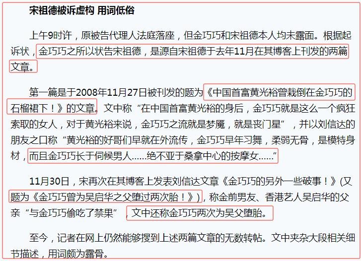 金巧巧见此,再也按捺不住,将宋祖德告上了法庭,要求删除这两篇文章,并公开赔礼道歉,且赔偿精神抚慰金100万元。