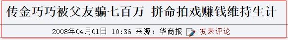 2008年4月,一个知情人说,金巧巧被老爸的朋友骗走了700万,百万钱财散尽,一切归零,只能被迫拼命拍戏赚钱维持生计。