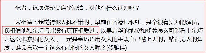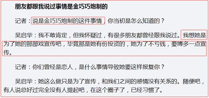 他指出,吴启华和金巧巧并没有真正相爱过,以吴启华的地位和修养,怎么可能看上金巧巧这么低素质的女人,一定是金巧巧用女人的手段自己贴上去的。