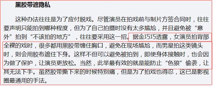 很多女演员拍背部全裸戏时,大多都用黑胶带缠住胸口,避免在现场尴尬。