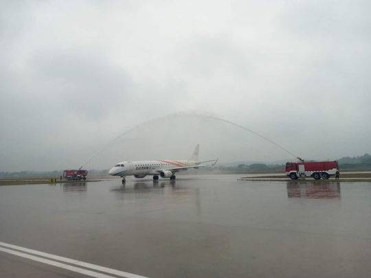 泸州云龙机场今日顺利通航,云龙机场行飞机“过水门”仪式,迎接第一架载客飞机成功落地
