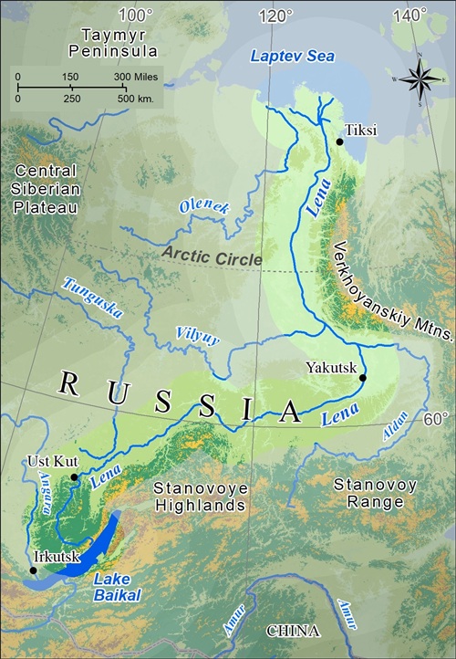 勒拿河发源于中西伯利亚高原东南部的贝加尔山脉,源头距离贝加尔湖只有7公里(贝加尔湖不属于勒拿河流域,属于叶尼塞河流域),流向东北方,接纳支流基廉加河、维季姆河和奥廖克马河。在雅库茨克转向北流动,先后与最大的两条支流阿尔丹河和流维柳伊河汇合,直到注入北冰洋的拉普捷夫海。勒拿河全长4400公里,流域面积为249万平方公里,年平均流量17100立方米每秒。
