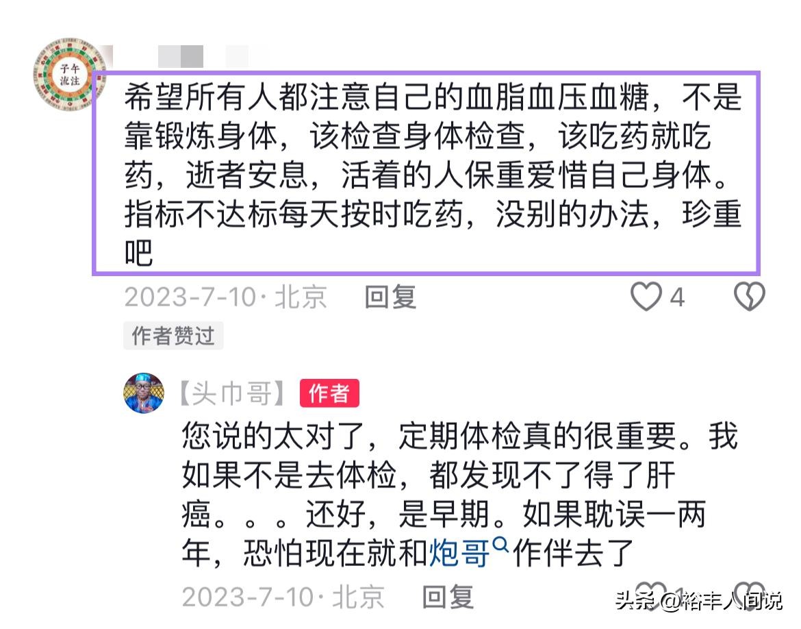 也许是命中注定,也许是坏习惯的影响。去年,同为北京老炮儿的网红“炮哥”不幸因病去世,作为好友的头巾哥发文悼念,并表示,如果自己不是定期前往医院检查身体,那么当时就很可能和炮哥一起去作伴了。