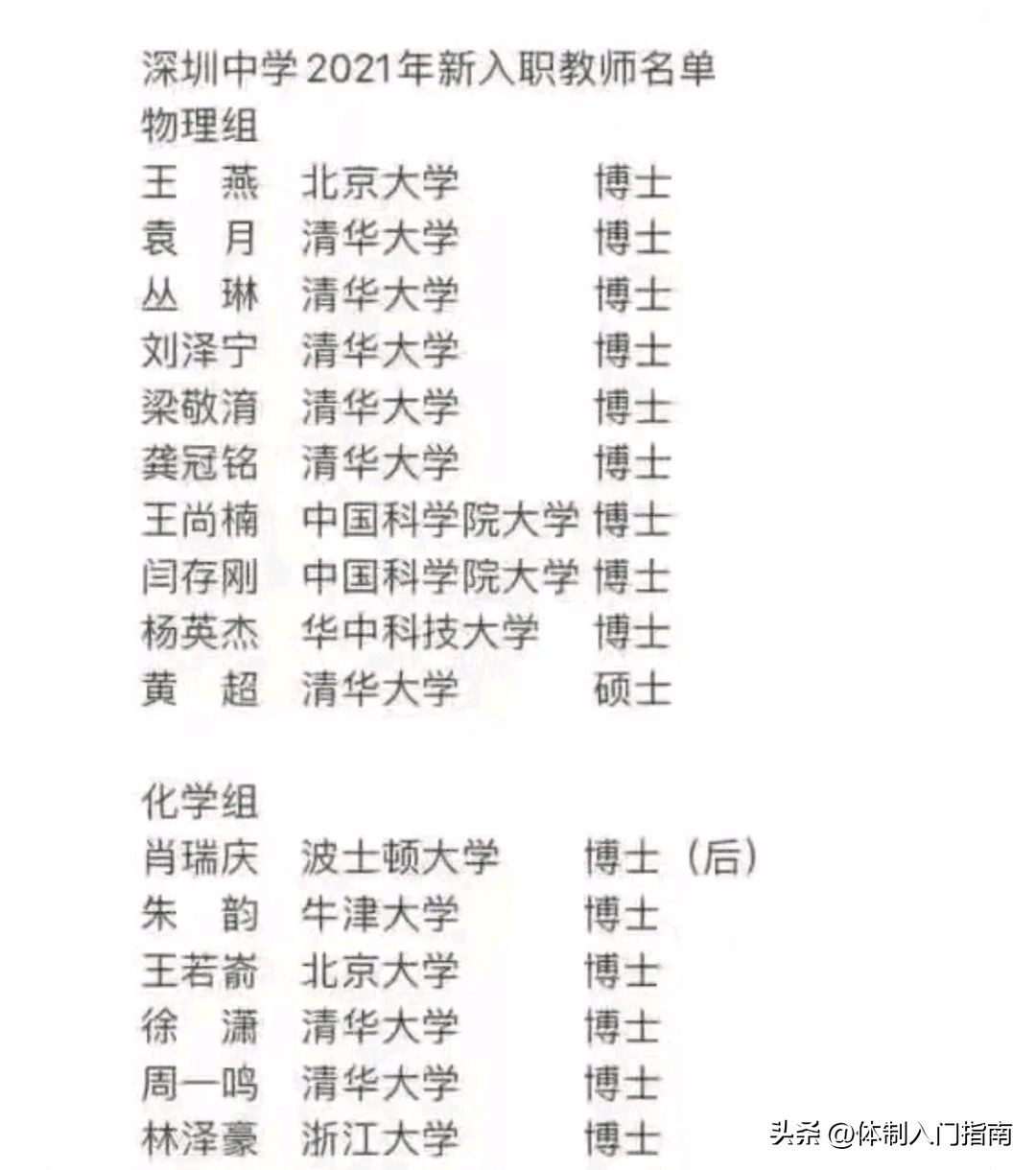 而且再来看看深圳市编制的难度,大家就一目了然。根据2021年新入职的深圳中学教师名单,清一色清华北大硕博毕业生,这条新闻当时还引发网友的广泛讨论。