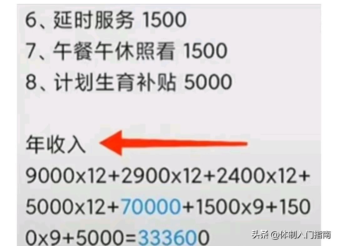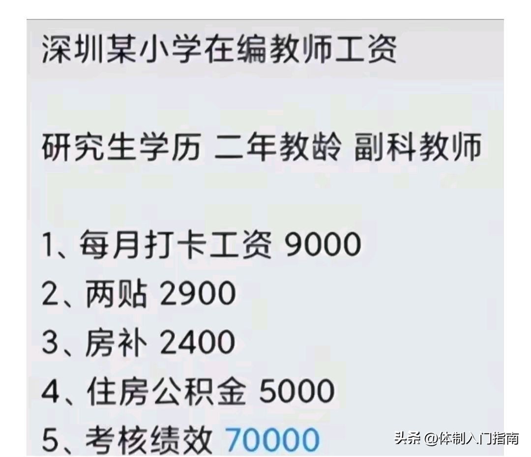 从网友公布的深圳某小学在编教师爆料的工资图来看,每个月工资大约9000元,住房公积金5000元,房补、补贴每月2500元,年底绩效大约7万元。那么,经过计算,深圳市在编小学教师年收入大约33.5万元左右。这个收入水平,放在全国排上第一位!