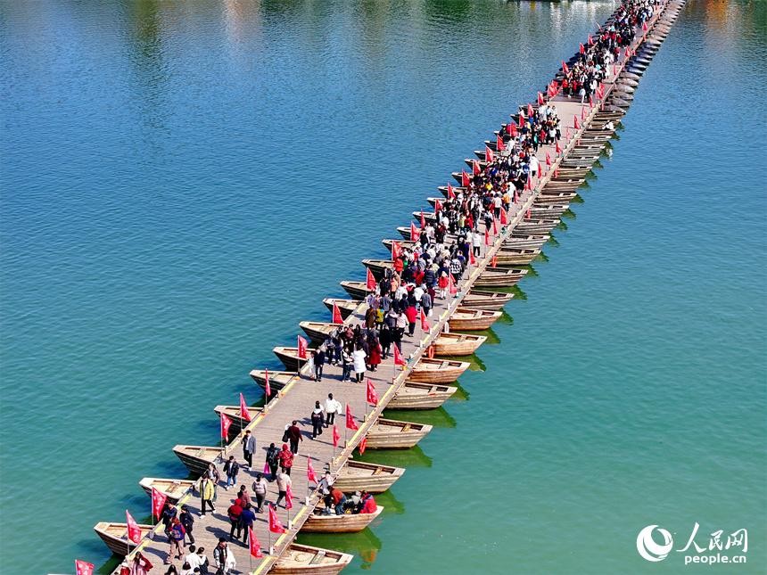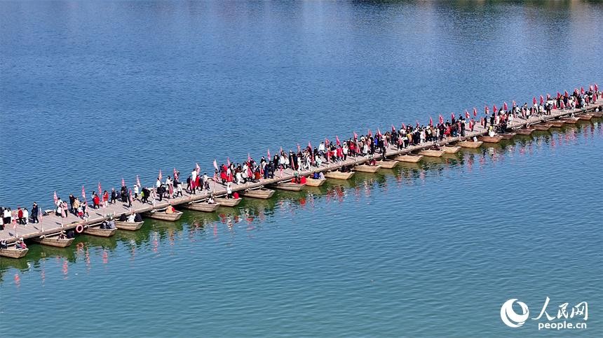 赣州市章贡区的赣州宋代古浮桥,许多游客前来参观游玩,体验其独特的历史文化魅力。人民网 朱海鹏摄