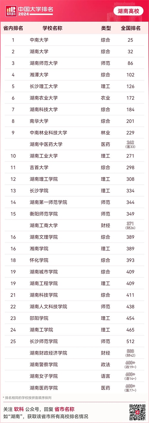 2024湖南高校排名出炉!中南大学稳居第一!湖南大学排名优秀