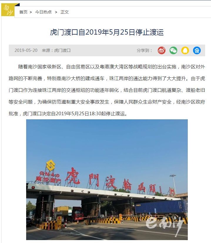 “虎门渡轮5月25日关闭”