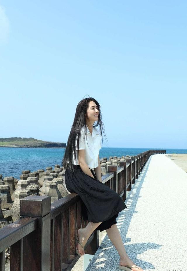 白色的衬衫搭配黑色的纱裙,看起来文静优雅,长相甜美清纯的郭碧婷真是穿搭造型的“百搭女王”,即便是款式相对普通的黑白套装都给人一种不一样的穿搭感受,再加上一头黑色的长发随着海风飘扬,美感十足。长相比较小家碧玉的妹子可以尝试这款穿搭,下身搭配的话可以选择高跟鞋,显得大方气质,也可以像郭碧婷这样穿一双非常休闲随意的人字拖,显得清凉休闲。