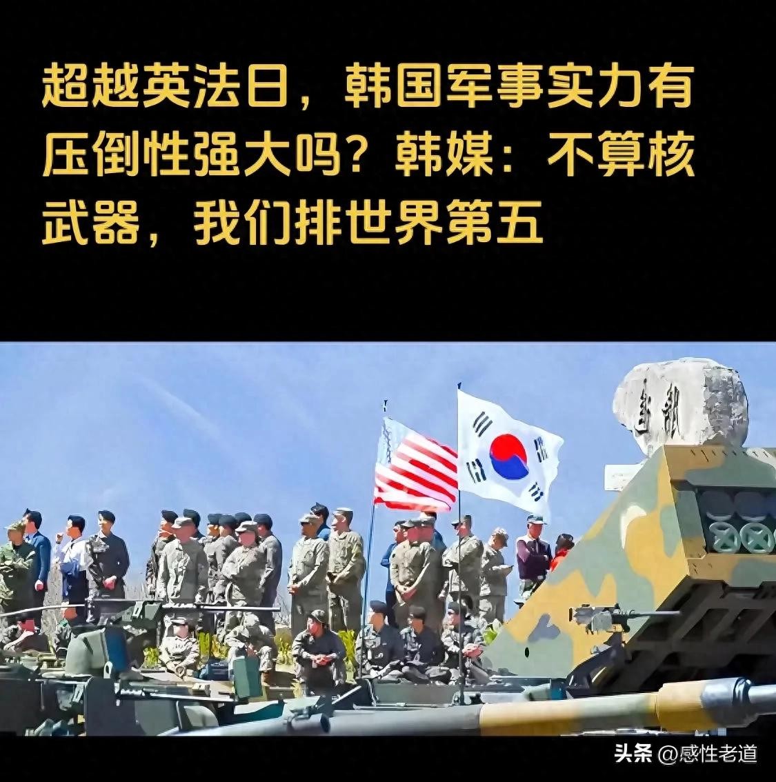 韩国网友认为韩国拥有世界前十的军事实力,甚至可能上升到世界第五,主要是基于以下几个方面的考虑:韩国作为亚洲四小龙之一,经济实力雄厚,为军事发展提供了有力支撑。韩国拥有约5200万人口,为军队提供了充足的人力资源。韩国军队装备了大量的现代化武器装备,如F-35A隐身战机、世宗大王级宙斯盾驱逐舰等。韩国高度重视国防建设,不断加大对军队的投入,提升军队的战斗力和现代化水平。