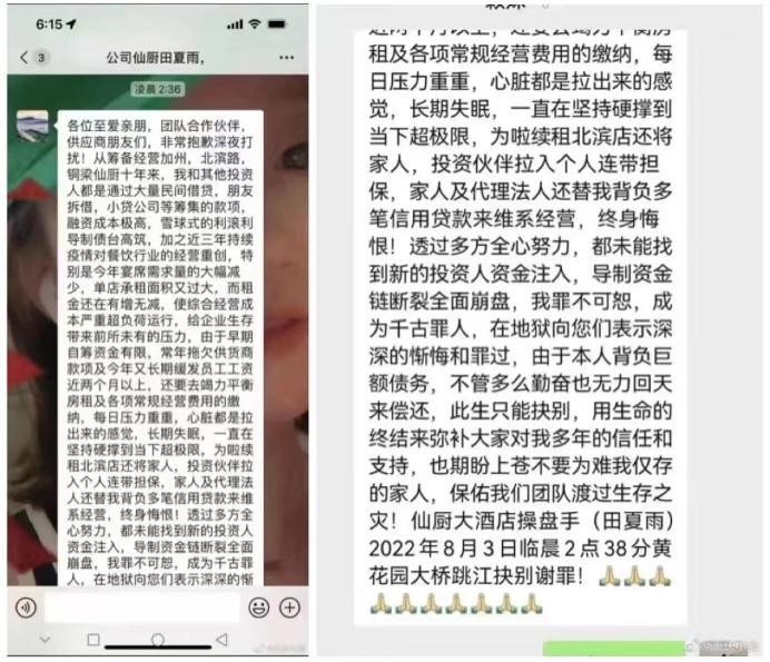 但在16年之后,据媒体报道,2022年8月3日凌晨2:36分,重庆重庆仙厨大酒店老板田某某,在微信上发出一封如下的“诀别书”后,疑似跳江。