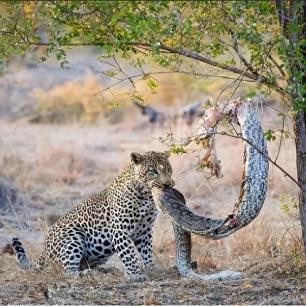 豹子正在享用它的战利品“大辣条”