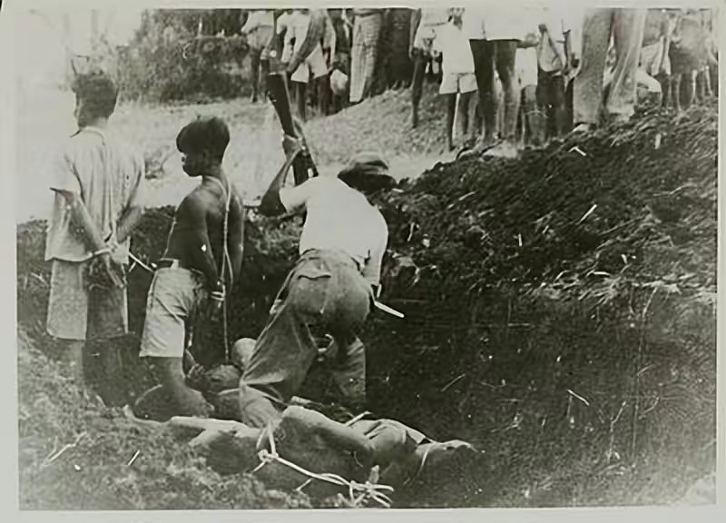 渐渐的,印尼的母亲河布兰塔斯停止流动,河中浸满了尸体,河道已被阻塞。在两旁的木桩上也挂满了无头尸,头颅被摆在路边,大街小巷,鬼哭狼嚎,横尸遍野,宛如人间炼狱。