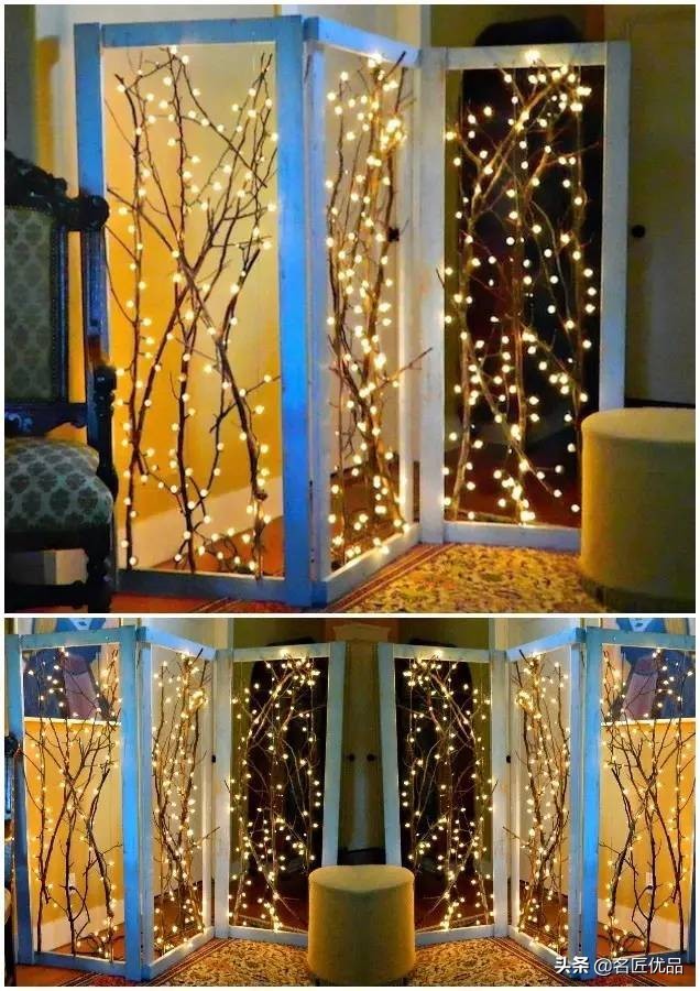 几根树枝插在废弃门框内,挂上小灯