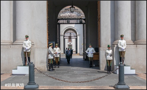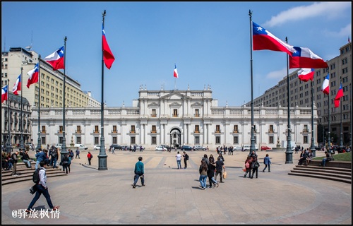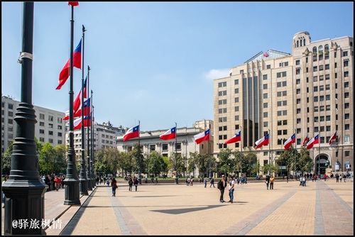 从圣卢西亚下山,步行十几分钟,即可抵达拉莫内达宫,也就是智利总统府,这里原为皇家铸币厂,智利独立之后被征用为总统府,总统府前的广场被冠名为“宪法广场”。