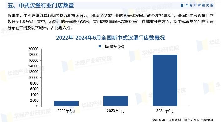 近年来,中式汉堡以其独特的魅力和市场潜力,推动了汉堡行业的多元化发展。截至2024年6月,全国新中式汉堡门店数升至1.8万家;其中,塔斯汀的表现最为突出,其门店数量现已超8000家。在城市分布方面,新中式汉堡的门店主要分布在三线及以下城市,占比近六成。