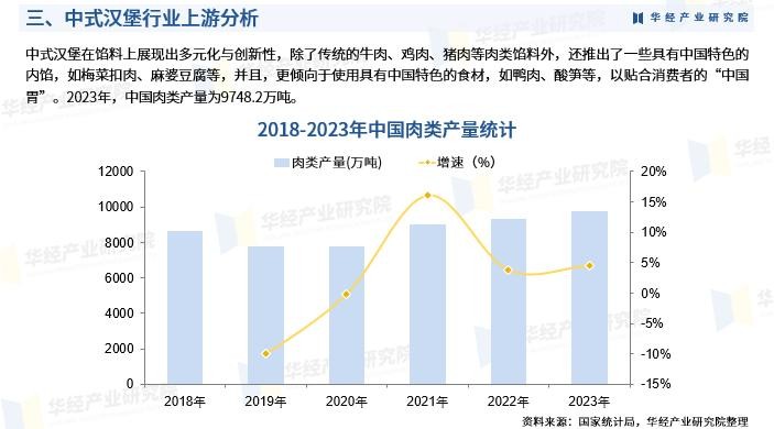 产业链来看,上游为原材料供应环节,涉及面粉、肉类(牛肉、鸡肉等)、蔬菜、调味品以及包装材料等;中游为中式汉堡店的运营环节,负责中式汉堡食品的制作、销售和服务;下游则是终端消费者,消费者通过中式汉堡门店或在线平台等渠道购买汉堡食品。中式汉堡在馅料上展现出多元化与创新性,除了传统的牛肉、鸡肉、猪肉等肉类馅料外,还推出了一些具有中国特色的内馅,如梅菜扣肉、麻婆豆腐等,并且,更倾向于使用具有中国特色的食材,如鸭肉、酸笋等,以贴合消费者的“中国胃”。2023年,中国肉类产量为9748.2万吨。