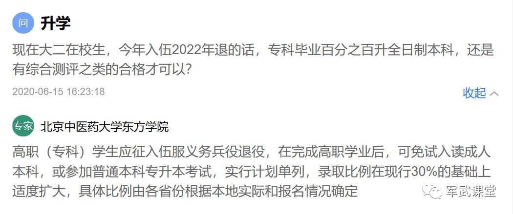 根据今年关于做好2020年大学生征兵工作的通知精神,高职(专科)毕业生及在校生(含高校新生)应征入伍,退役后在完成高职(专科)学业的前提下,可免试入读普通本科,或根据意愿入读成人本科。理解这句话,主要有以下几点: