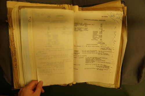 The net increases of weight in 5887 tons due to these items,and by weight equation methods,the increase of displacement is 20900 tons.Therefore,based on Lion 1938,the new design has the following dimensions - 881‘ on W.L. x120‘ x35‘ x67000tons deep.Design C was prepared to investigate the possibility of reducing the length and displacement of design A:- 950‘ on W.L. x120’ x35‘ x67000 tons deep.This showed that a satisfactory solution was feasible provided the estimate of all fuel was reasonably correct.Design D was an attempt to reduce length and displacement still further to:- 925‘ on W.L. x120‘ x35.6’ x66000 tons deep. This design shows a small deficiency in the weight available for armour. A more detailed investigation of this design would be necessary to check the disposition of the weights in the various groups. Note:- The oil fuel capacity was calculated for an endurance of 6000 miles at 20 knots when 6 months out of dock in the tropical waters,assuming a consumption of 0.75 lbs/S.H.P./hour,allowing 5% residue.In design C & D,Mr. Paradise was asked to give a check on the oil fuel figures of 7500 tons,and agreed that this was reasonable but thought that E. in C. would probably ask for about 8000 tons to allow for the effect of the Tropical conditions. In this case,the design A. B. C. and D. will show excess of weight over displacement up to 500 tons,indicating that the deep displacements given are on the low side.It is considered that the citadel length taken the minimum possible and the detailed drawing work is needed to determine whether it needs to be increased. (Summary of calculations on legend attached.)