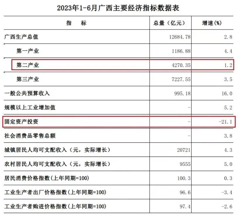 今年上半年,广西的第二产业增速仅1.2%,固定资产投资增速-21.1%,这两项关键指标实在拉垮。