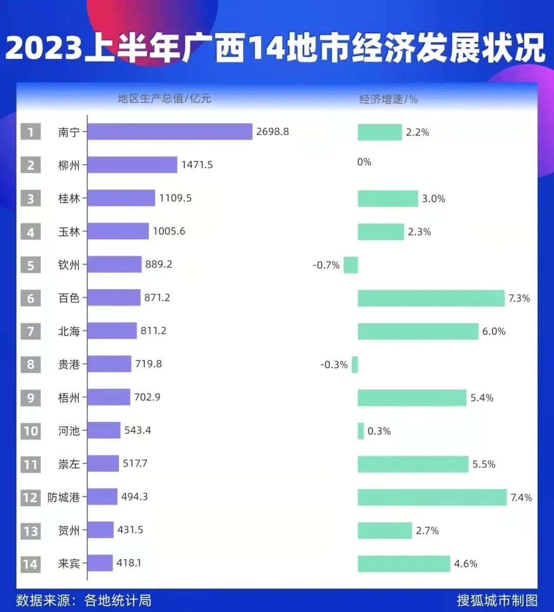 更离谱的是,今年上半年全国GDP200强城市中,唯一“零增长”的城市,唯二“负增长”的城市,都在广西。