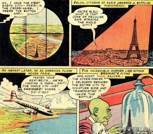 超人用他的超级视力观察地球发现布莱尼亚克利用缩小技术将巴黎、雅典等地球城市缩小收藏在他的瓶中,超人想要阻止布莱尼亚克却完全不是对手。