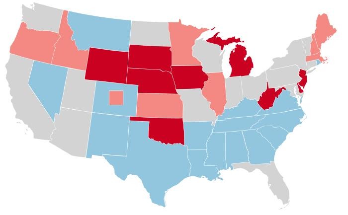 1942年中期选举初赛:红色为共和党势力、蓝色为民主党