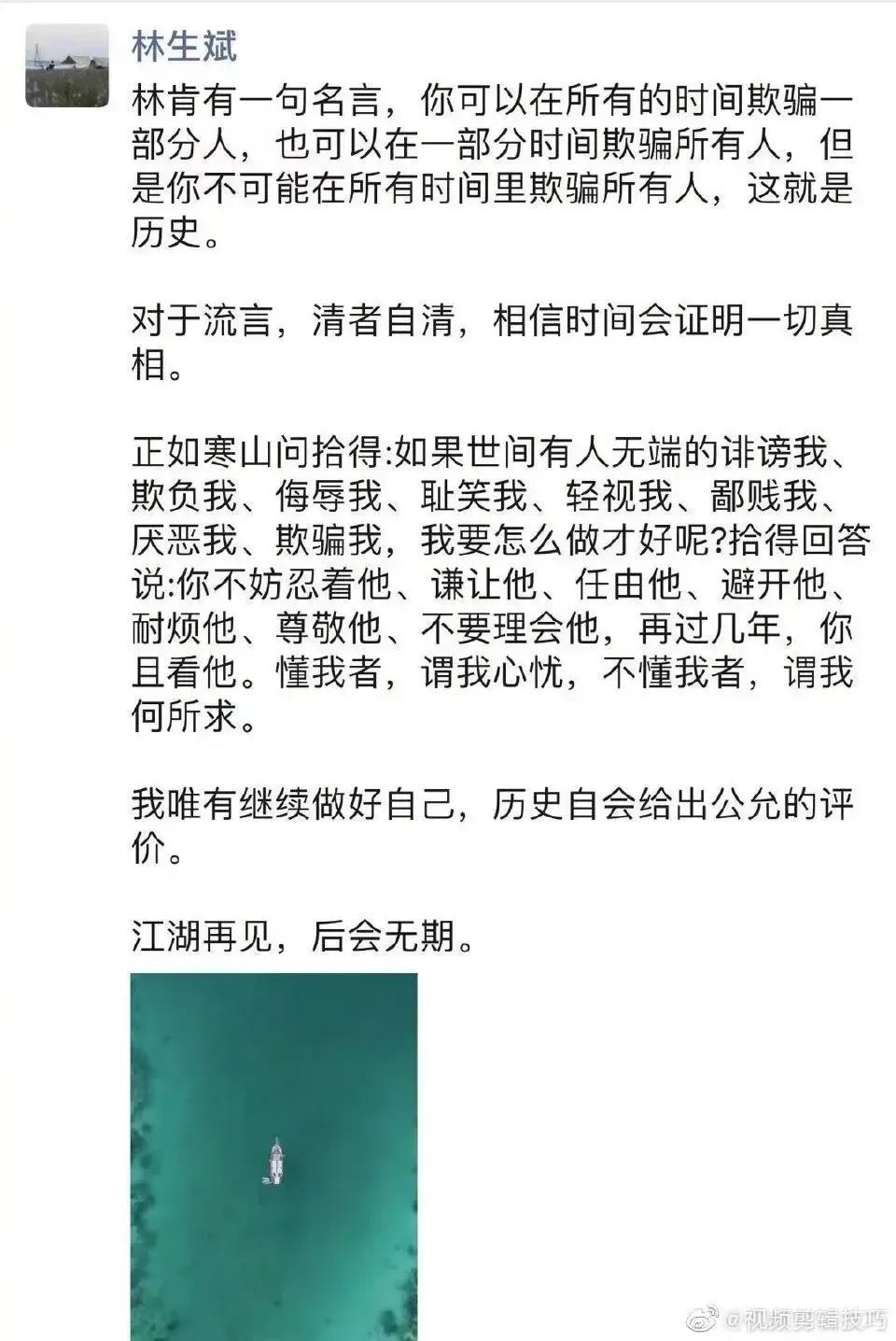小学毕业的林生斌的文笔惊人,他退出网络,下架网店,对网上的质疑声不回应,发的几篇文章也是避重就轻,还在借着孩子卖惨。