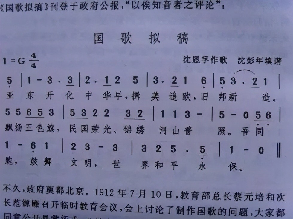 国歌是代表国家的歌曲,国歌由中央政府制定或选用。1912年1月1日,中华民国南京临时政府成立。为制定国歌,教育部于2月3日发布通告:“今者民国成立,尚未有美善之国歌。以供国民讽咏,良用恧焉。本部现拟征集歌谱,俟取材较多,再敦请精于斯学者共同审定,颁行全国。”通告发布后,各界人士纷纷投稿。2月25日,《南京临时政府公报》上刊登一应征稿件,名为《亚东开化中华早》,其歌词是: