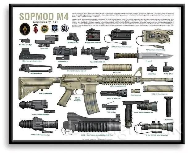 当SOPMOD M4配上一些近战用的战术附件时,又会称之为CQBW M4,即“室内近战武器型M4”,实际上都是同一个东西来的。