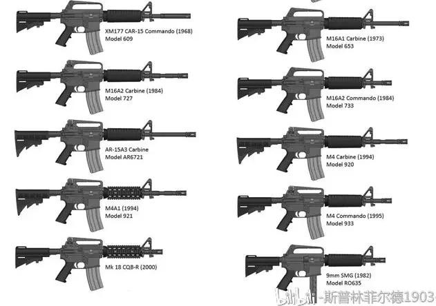 M4卡宾枪的型号众多,复杂多样。它是由美国柯尔特公司研发的M16A2为原型开发的。下图为M4卡宾枪衍生前的型号(包括M4A1)。例如Model609、Mode653等等