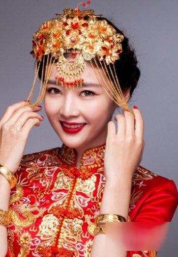 中式新娘发型的发饰是很精美的,流苏造型的发丝就像刘海一样对脸型也是有一定修饰作用的,这款黑色的长发做成编发盘发造型,气质感的低盘发搭配红色嫁衣,很端庄大气的造型。