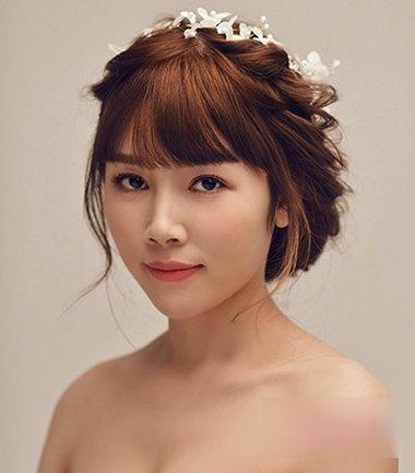 新娘怎么做盘发发型好看呢?圆脸斜刘海编发盘发发型,将额头上的头发梳到靠侧边的直发,两边的头发梳好内扣的碎发发丝,后侧的头发做成比较蓬松的编发盘发发型,发饰要尽量细碎一些。