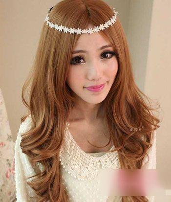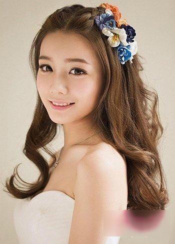 新娘的发型也不要局限于盘发发型,大圆脸的新娘不妨尝试一下披散下来的卷发,但是作为新娘也不要忘了发饰的点缀哦,这款黄色的长发梨花头采用外翻的螺旋烫发,在发顶搭配蕾丝花环,很唯美的造型。