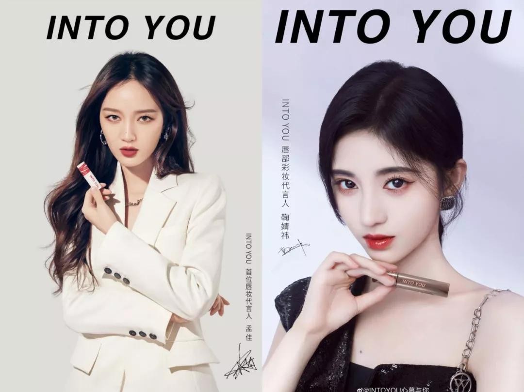「INTO YOU」 的首位唇妆代言人是二代女团 MISS A 的舞担、《乘风破浪的姐姐》第三名“出道”选手孟佳。「INTO YOU」 的第二位唇妆代言人是鞠婧祎,也是目前主要代言人。