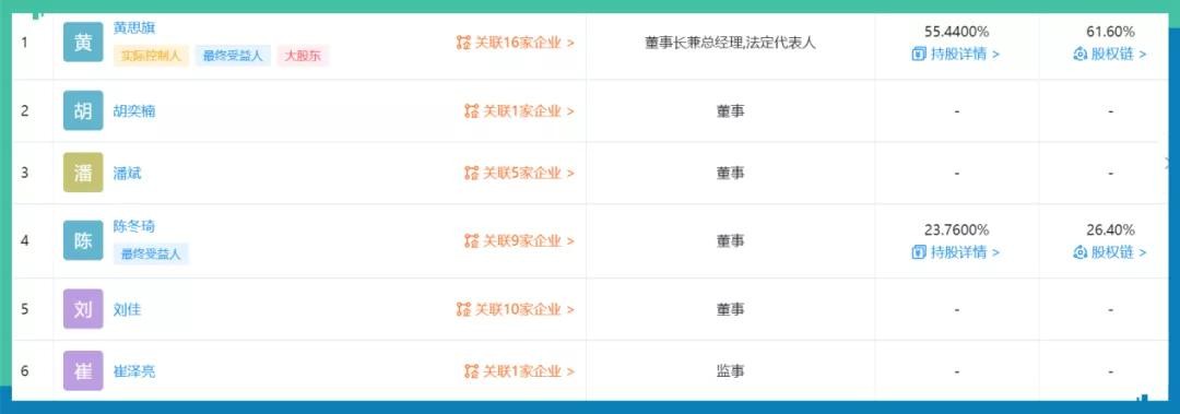 根据企查查数据,目前上海丽知品牌管理有限公司主要人员有黄思旗、陈冬琦、胡奕楠、潘斌、刘佳、崔泽亮等 6 位,其中黄思旗和陈冬琦持有公司大部分股权,黄思旗同时担任公司法人。
