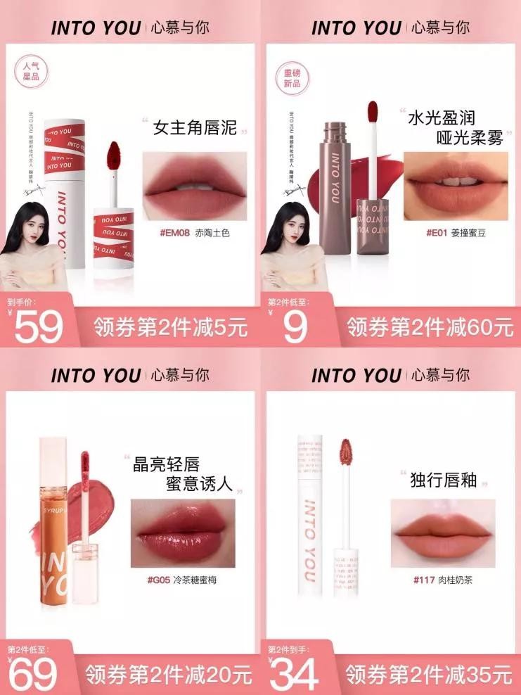从定价上来看,「INTO YOU」整个来看还是一个走平价路线的美妆品牌,根据其天猫旗舰店标价产品定价基本都在 59-89 之间,算不上顶便宜,但也绝对符合中国美妆的“高性价比”特点。而且不论是购物节大促还是上新时,店铺经常会推出诸如第二只 9 元/第二件半价/两件减 N 元等优惠活动,因而客观上进一步降低了产品单价。当然一系列促销活动和其目前仍处于快速增长期有关。