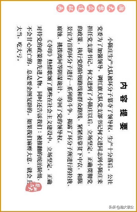 内容提要:小陈庄生产大队被坏分子篡夺了领导权,生产十分落后。公社党委为了加强领导,调红旗大队党攴部书记何文进同志到小陈庄来担任党支部书记。何文进到了小陈庄以后,立场坚定,正确贯彻党的政策,执行党的阶级路线和群众路线,紧紧依靠贫下中农,和陈景宜为首的坏分子进行一系列的斗争,揭露了坏分子所进行的拉拢、腐蚀、挑拨离间等阴谋诡计,夺回了党的领导权。《夺印》热情歌颂了那些在社会主义建设中,立场坚定,正确对待党的政策和先进人物。同时还告诉我们:被推翻的统治阶级不会甘心死亡的,总是要企图复辟的。如果我们麻痹大意,就会上大当,吃大亏。