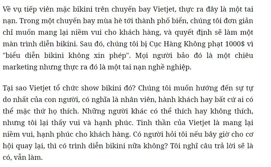 但是,几年之后,越捷航空作为接越南男足队回国的专机,在飞机上,空乘人员穿着性感来服务客人,这一事件又再一次引起热议,有人提议要抵制越捷航空,甚至有网友讽刺阮氏芳草:“你是想把Vietjet改成Vietjerk还是Vietsex呢?”